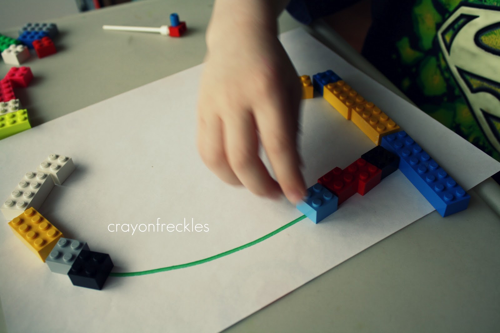 For letter recognition and writing, I wrote large A, B, and C on a piece of paper. He “traced” the letter by putting Legos on the letter lines.